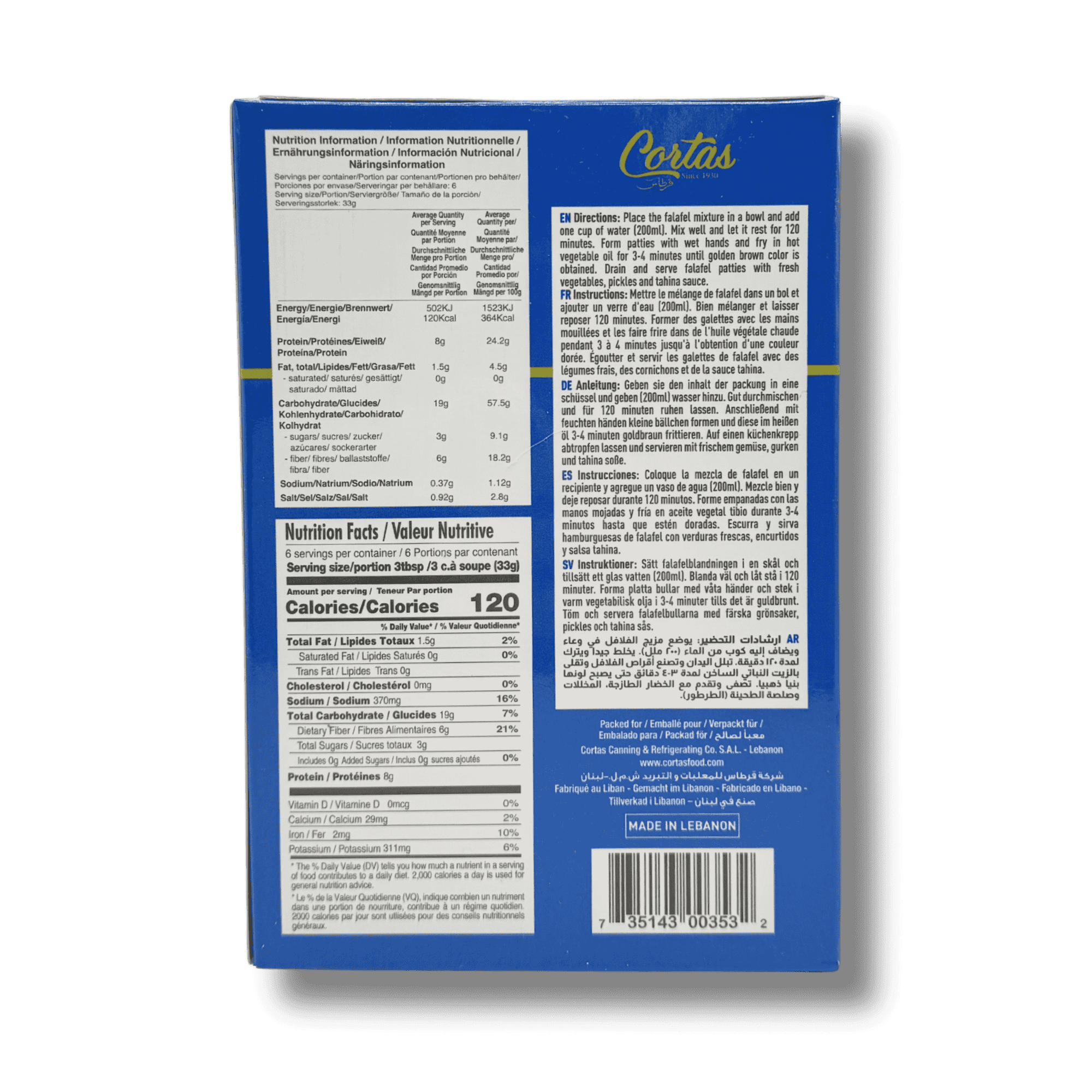 Cortas Falafel Mix is a ready-to-prepare blend made from ground chickpeas and carefully selected spices. Inspired by traditional Lebanese recipes, this mix allows you to prepare authentic falafel easily at home. Just combine with water, let rest, shape into patties or balls, and fry until golden brown and crispy on the outside while tender inside. Perfect for wraps, sandwiches, platters, or as a plant-based protein option for everyday meals.