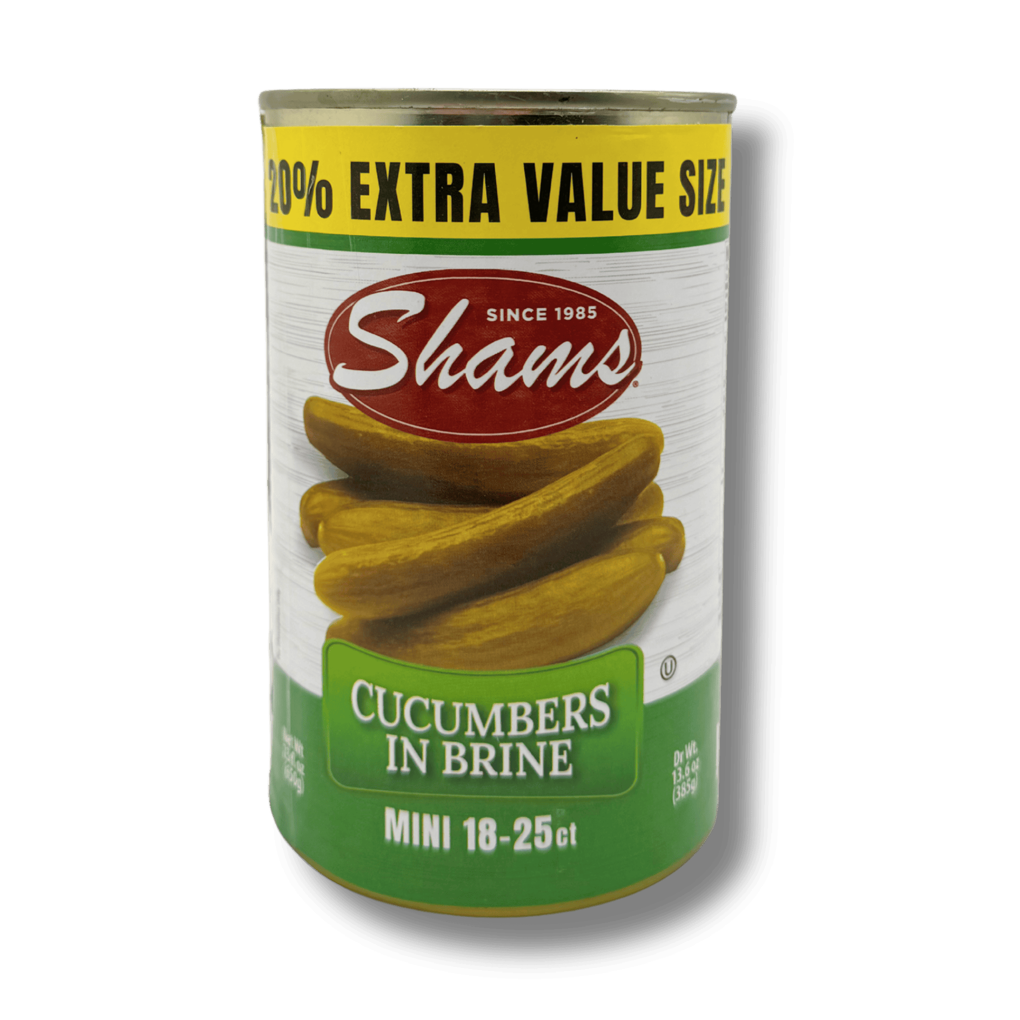 Cucumbers in brine. Brand: Shams. Ready-to-serve pickled cucumbers suitable for meals and side dishes.