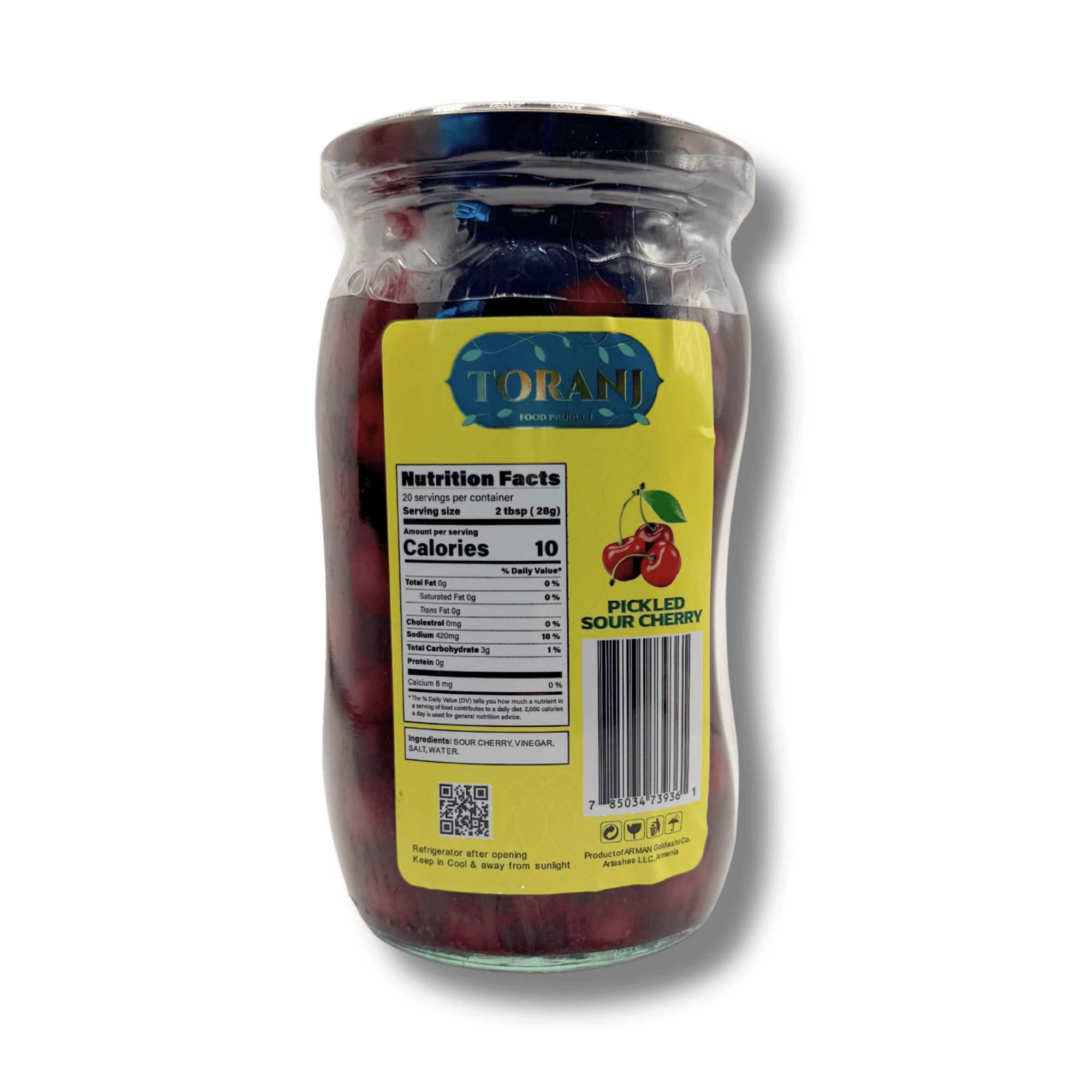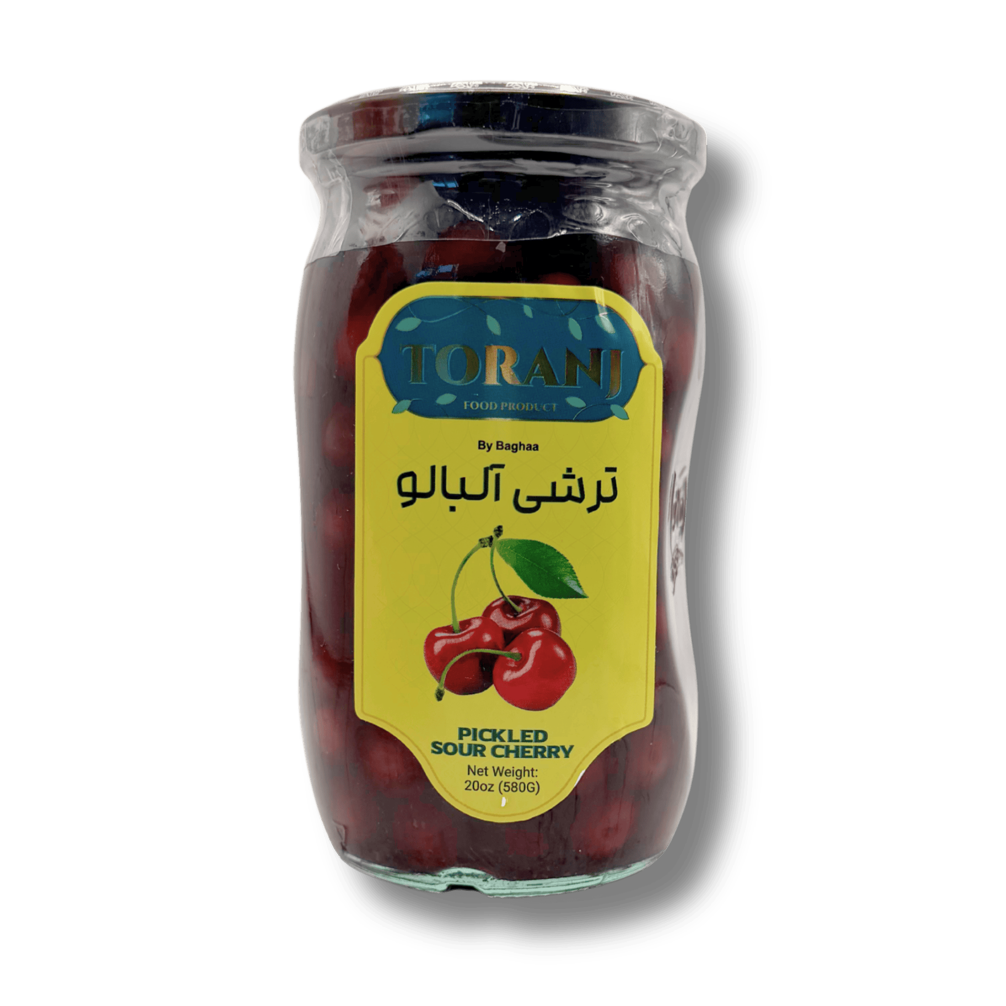 Pickled sour cherries (Torshi Albaloo). Brand: Toranj. Ready-to-serve pickled fruit suitable as a side or accompaniment.