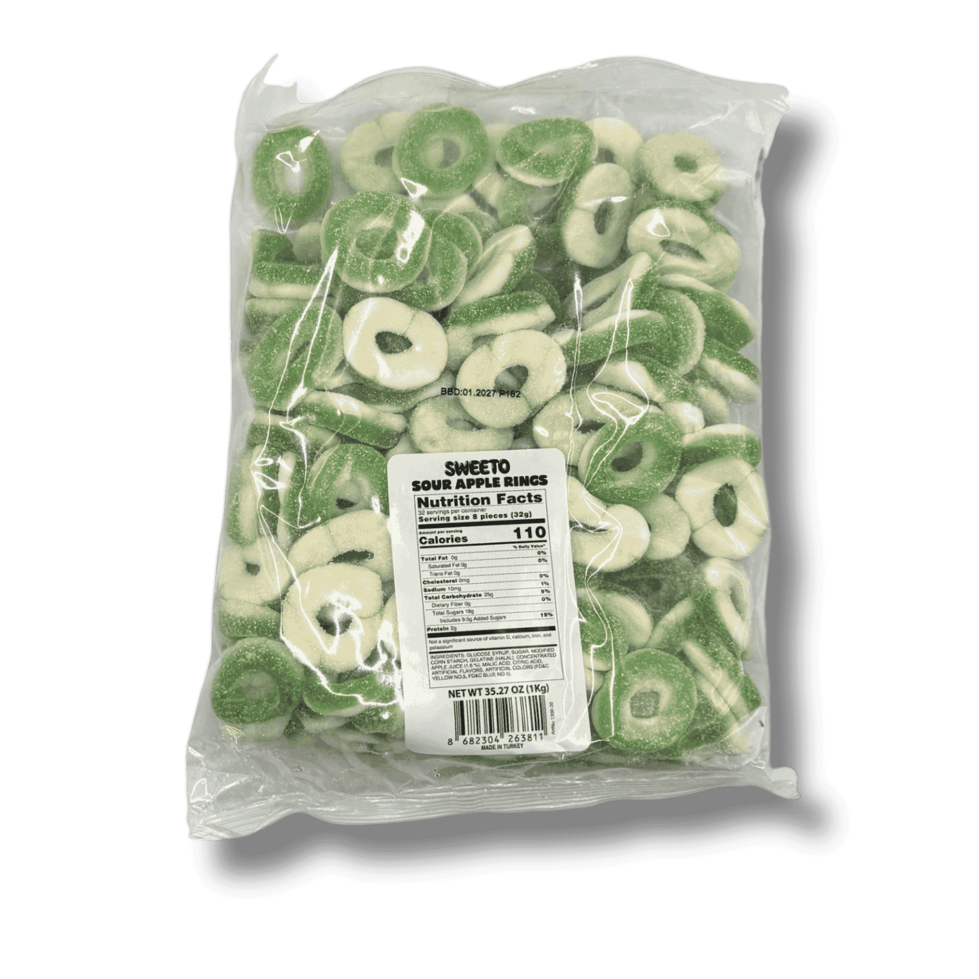 Sour Apple Gummy Rings are soft, chewy ring-shaped candies coated with a light sour sugar finish. Each bite delivers a bright green apple flavor balanced with sweetness, making them a favorite among sour candy lovers. Packaged to preserve freshness and texture.